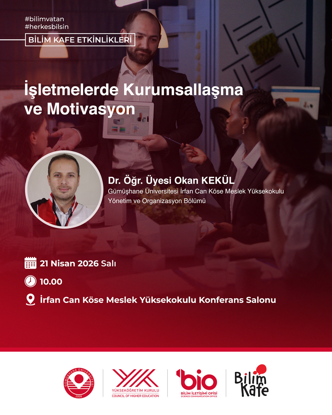 Üniversitemiz Bilim İletişim Ofisi “Bilim Kafe” etkinlikleri kapsamında, Gümüşhane Üniversitesi İrfan Can Köse Meslek Yüksekokulu Yönetim ve Organizasyon Bölümü Dr. Öğr. Üyesi Okan KEKÜL tarafından öğrencilerimize yönelik, "İşletmelerde Kurumsallaşma ve Motivasyon"başlıklı bir program gerçekleştirilecektir.