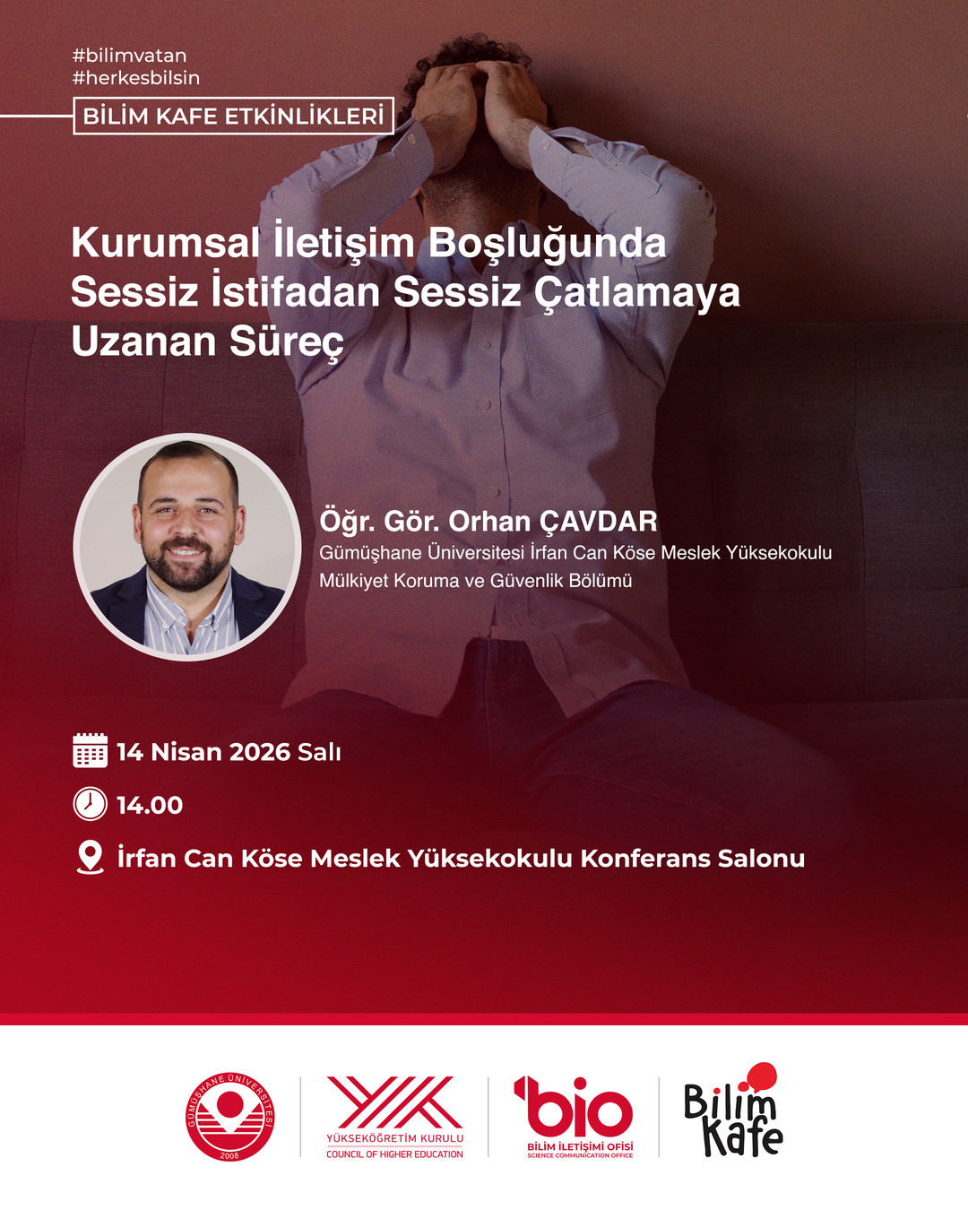 Üniversitemiz Bilim İletişim Ofisi “Bilim Kafe” etkinlikleri kapsamında, Gümüşhane Üniversitesi İrfan Can Köse Meslek Yüksekokulu Sosyal Güvenlik Programı Öğr. Gör. Orhan ÇAVDAR tarafından öğrencilerimize yönelik, "Kurumsal İletişim Boşluğunda Sessiz İstifadan Sessiz Çatlamaya Uzanan Süreç" başlıklı bir program gerçekleştirilecektir.